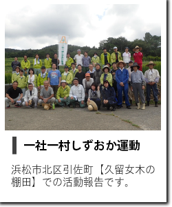 社会貢献活動 2017年6月17日 久留女木の棚田 UAVから撮影 当社では、豊かな地域づくりと持続可能な発展に向けて、エコアクション21・環境に配慮した技術提案・環境保全の教育訓練などに取り組んでいます。地域に根差した企業の一員として、次のような活動に参加しています。 〒433-8112 静岡県浜松市中央区初生町889番地の2 TEL:053-439-6111 FAX:053-439-6129 一般事業主行動計画 Copyright Fujisougou Consultant Co.,Ltd. All Rights Reserved.