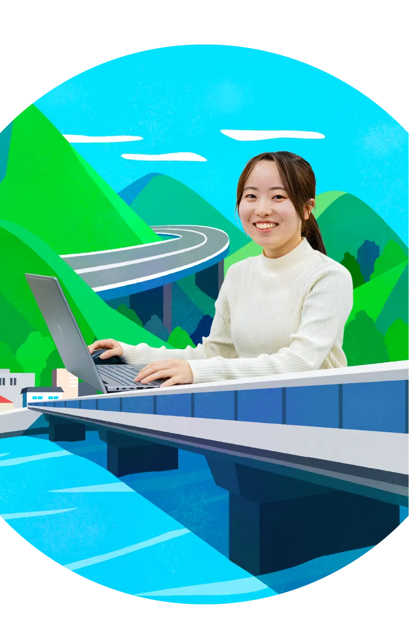 ダイナミックな仕事!道路・橋梁などのインフラ整備に幅広く関わっています。スケールの大きいダイナミックな仕事ができるのも、この仕事の魅力です。