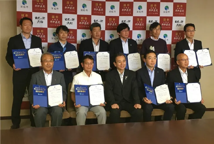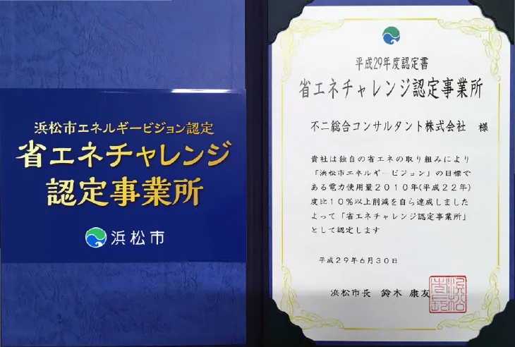 平成29年度「浜松市再エネ・省エネ事業者認定事業所」の認定を受けました。この制度は、浜松市が再生可能エネルギーの導入や省エネルギー化に取り組む事業者を再エネ・省エネ事業者として認定する制度です。今回は、省エネチャレンジ認定事業所に認定されました。